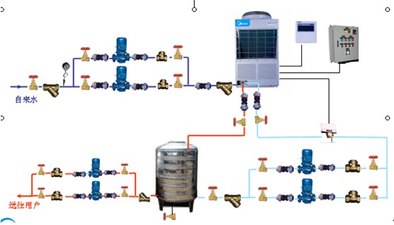 中央熱水供應系統則一般由主機、保溫儲水箱、熱水增壓泵、循環水泵、截止閥、電磁閥、單向閥、系統水管道等設備、零部件組成。